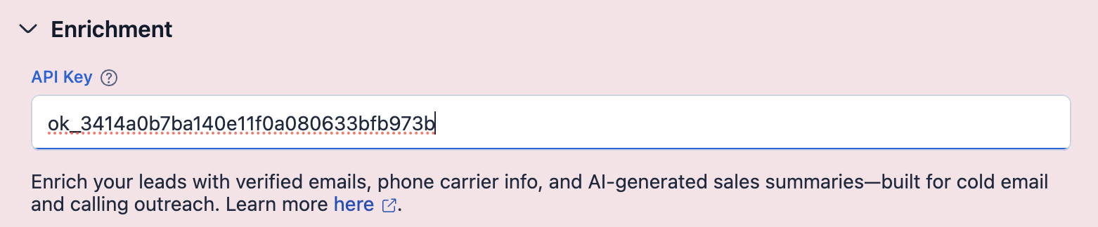 Enter the copied API key in the "Enrichment" section and run it: