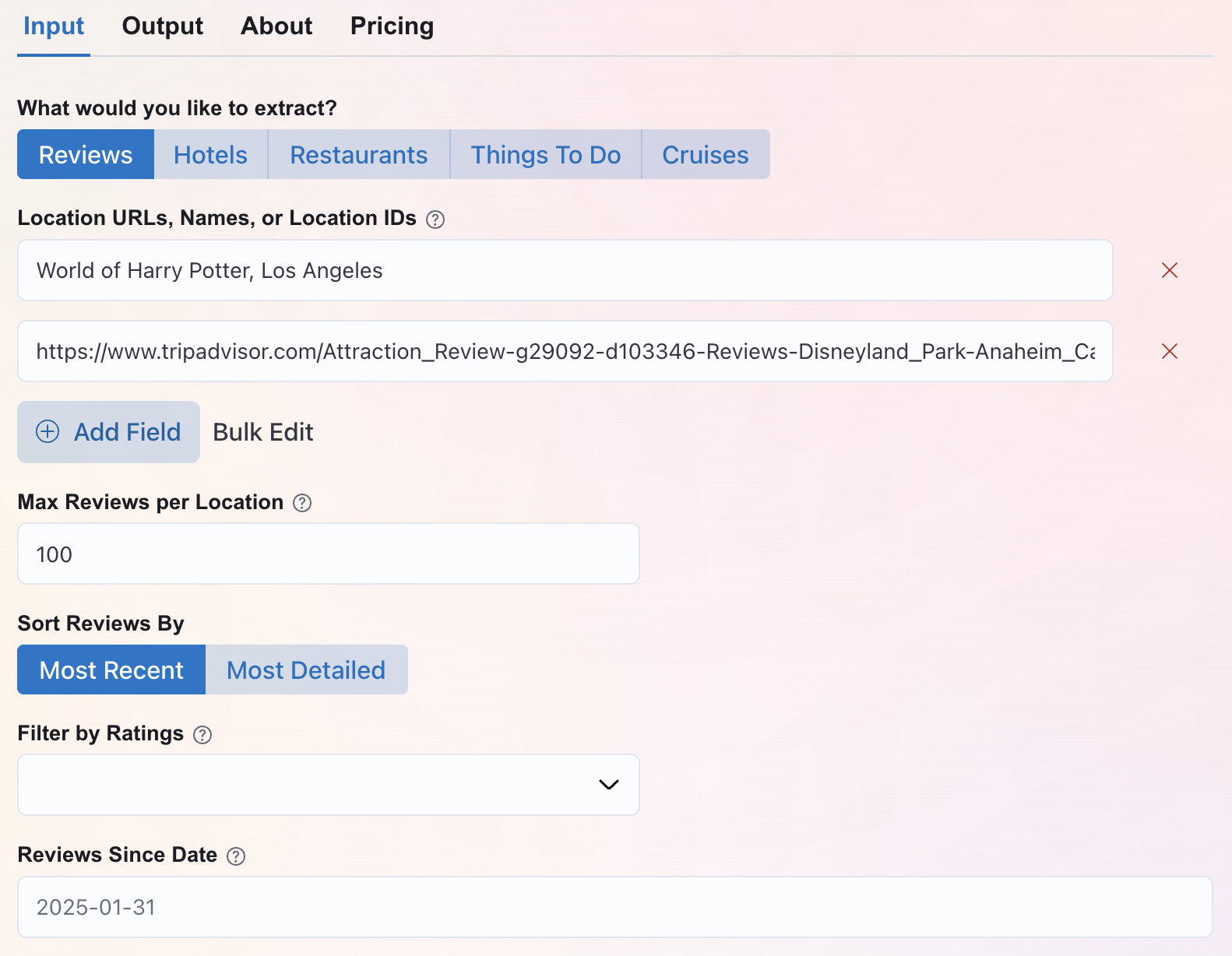 Type a city or location. Pick what you want—hotels, restaurants, or attractions. Hit "Run".