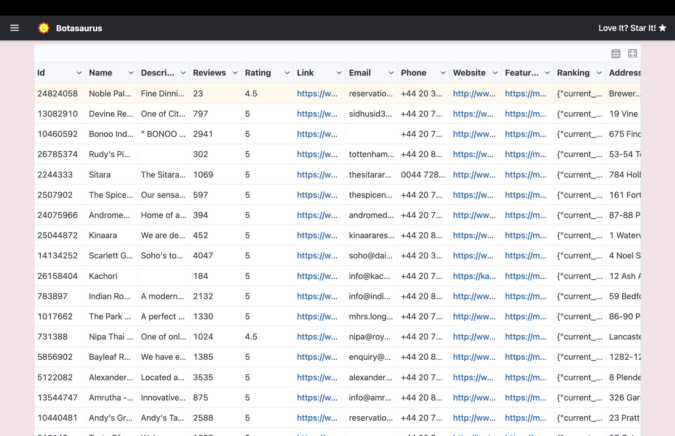 Get structured data in CSV or JSON. Names, ratings, reviews, websites, emails, phone numbers, addresses—everything you need.
